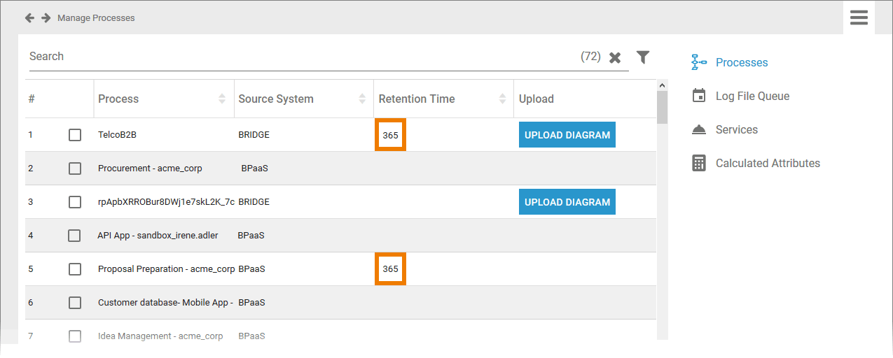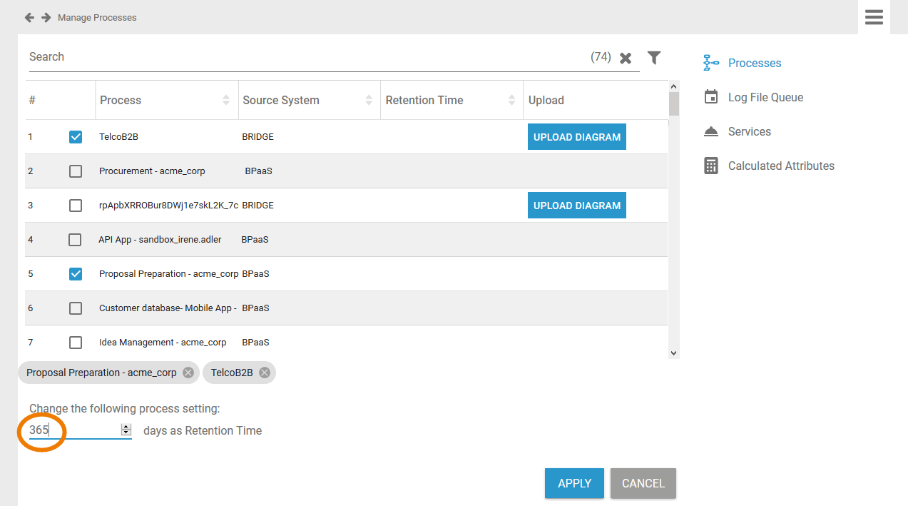 All chosen processes are displayed in the footer of the list. Now insert the desired retention time in days for the selected processes: