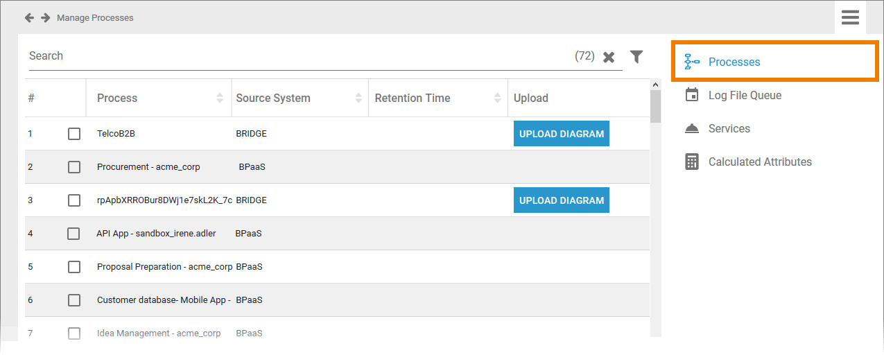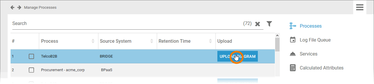 Upload | The Upload Diagram button allows you to add a BPMN diagram to Bridge processes. You can display the diagram in Scheer PAS Process Mining. |