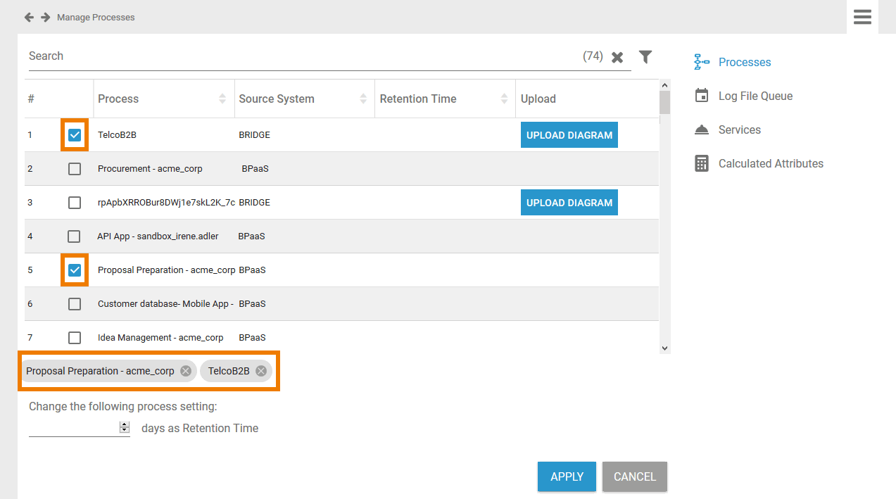 Use the corresponding checkboxes to select the processes you want to set the retention time for: