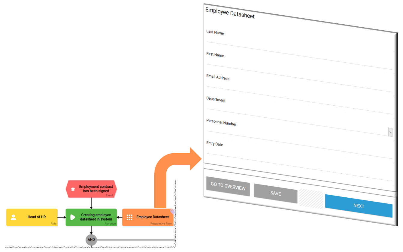 Function | You can open the EPC element Responsive Form to design your own form. The element will be attached to a Function. Once the corresponding Function is reached during process execution, the designed form opens and can be filled by a user. |