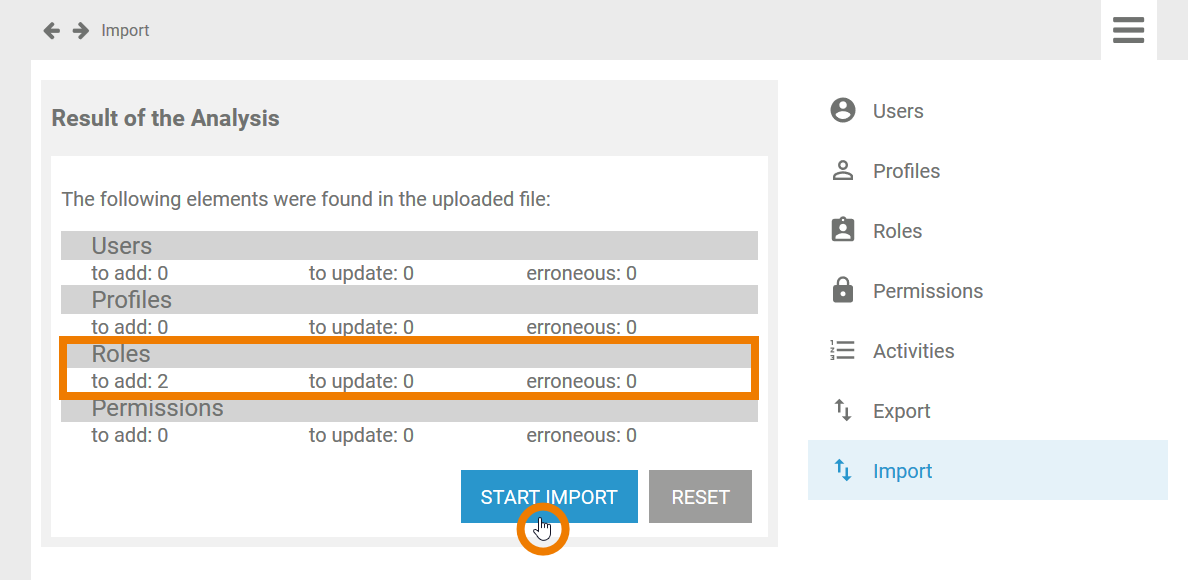 Then log in to the Administration of the target system and open menu Import. Drop you export file and wait for the result of the analysis to be displayed. The result shows the number of new roles that will be added to the Administration. Start the import: