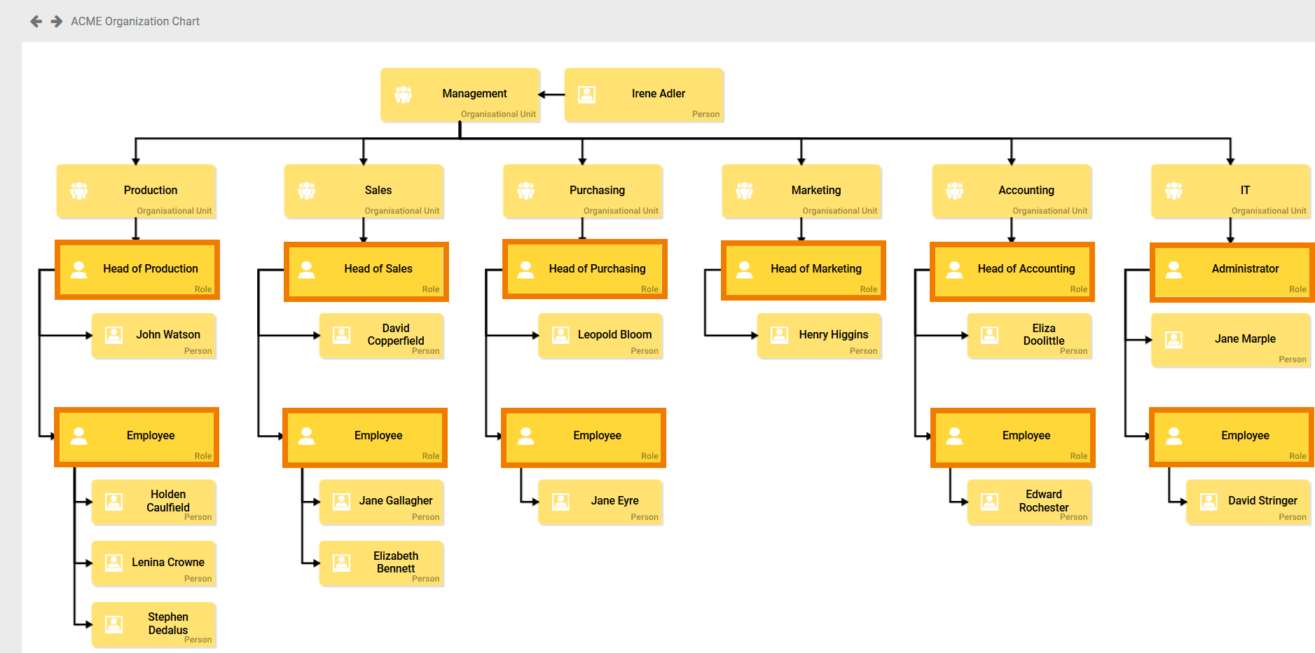 Example in Organizational Chart | In the ACME Organization Chart roles exist for Head of Production, Head of Sales, Head of Purchasing, Head of Marketing, Head of Accounting and Administrator as well as Employee. ![]() |
