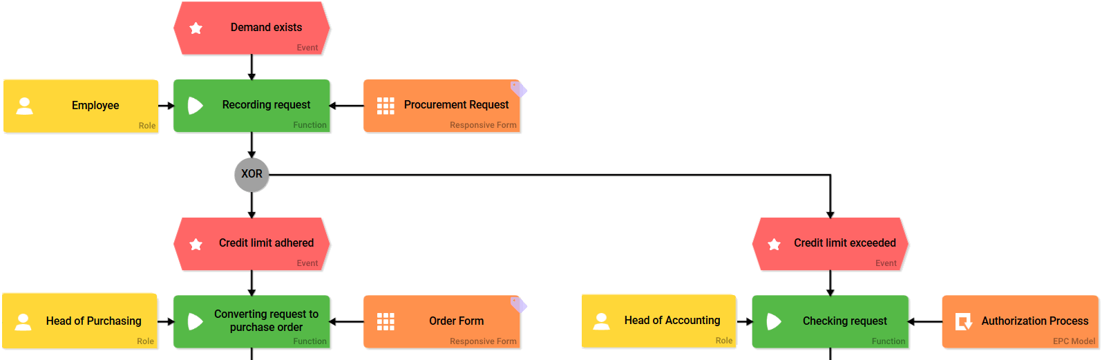 Example in | An ACME Employee can record a Procurement Request during the Procurement Process, he therefore executes the function Recording request. The Head of Accounting has to check the request, but only if the order exceeds the credit limit. If the value lies within the credit limit, then the Head of Purchasing can directly convert the request into an order. ![]() |