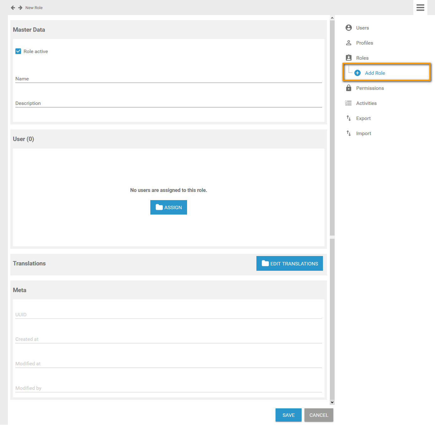 Selecting Add Role in the sidebar menu, an empty role data sheet opens: