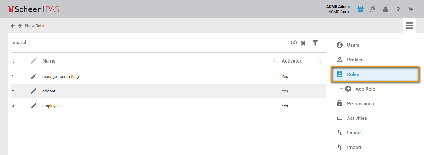 Roles are designed for use in Scheer PAS BPaaS. BPaaS designers use roles in EPC models to create approval workflows where designated user groups are only allowed to execute specific process steps instead of the whole process. Roles can be created in the Scheer PAS BPaaS editor during modelling as well as in the Scheer PAS Administration. However, roles can only be managed using your Scheer PAS Administration: In Menu Roles you can create, rename and translate roles. The Administration is also the only place where administrators can assign roles to users.