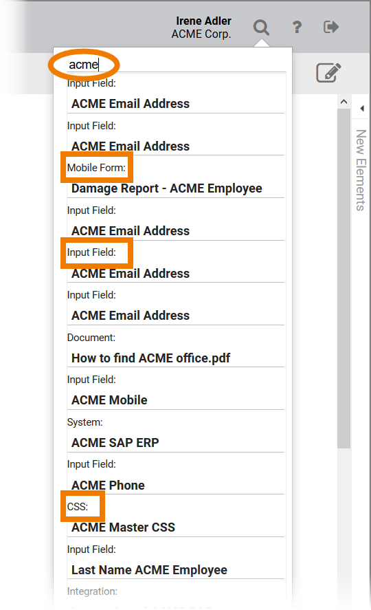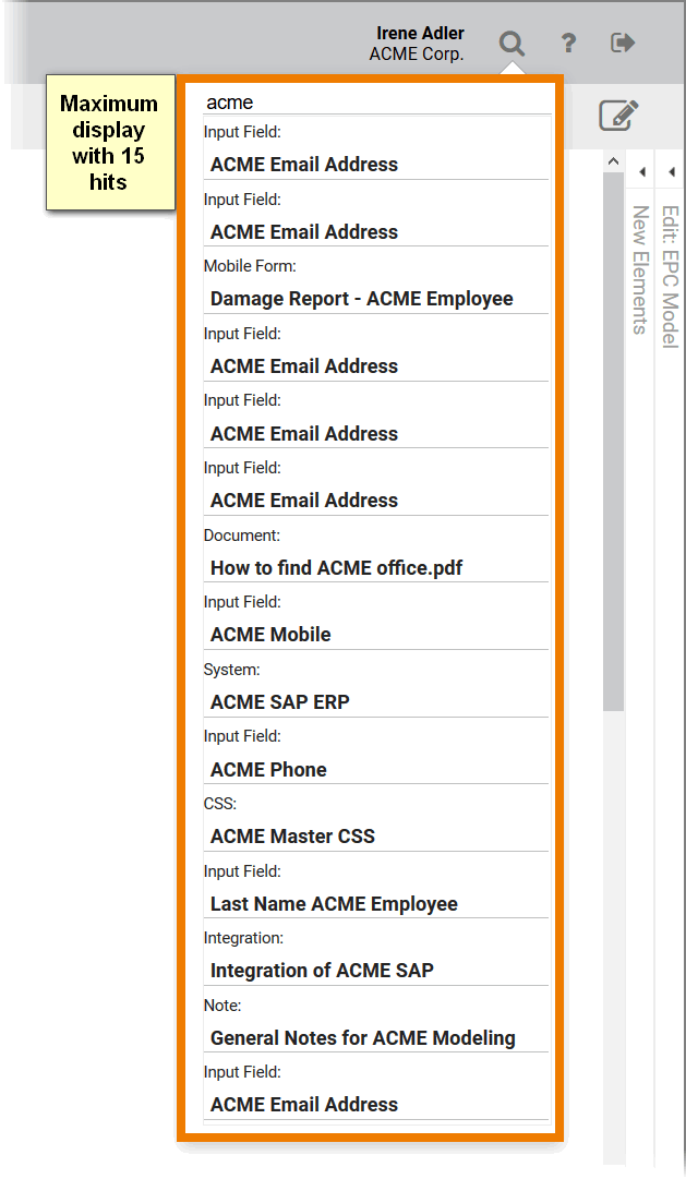 You can use the search at any level of the editor. The hits are displayed independently of the element type. If you enter a search word at the level of the project editor, all hits for the search criteria are displayed - regardless of whether they are project elements, EPC elements or form elements: