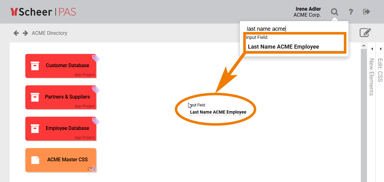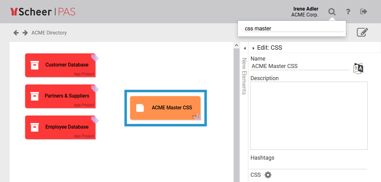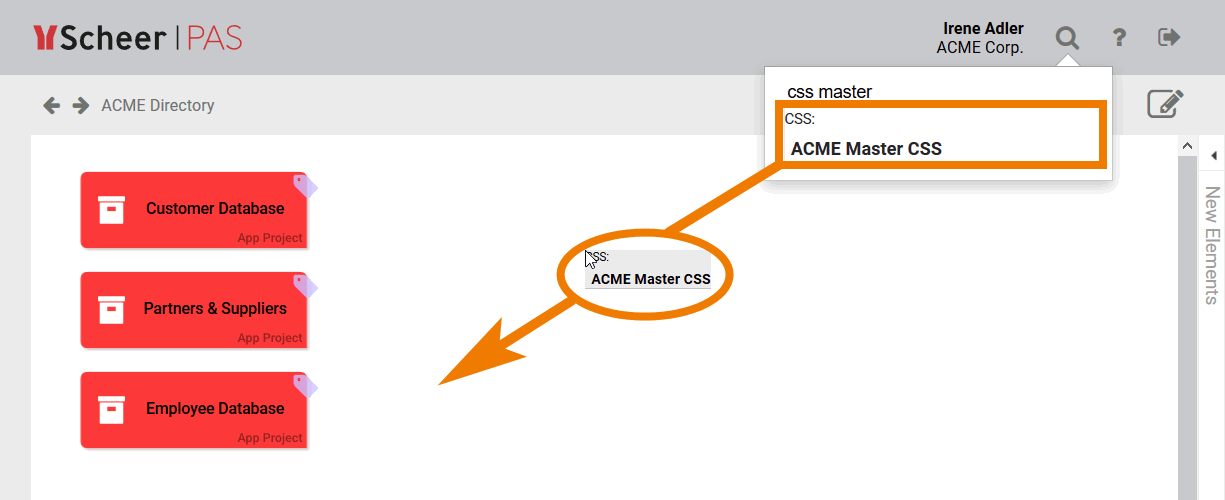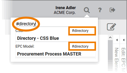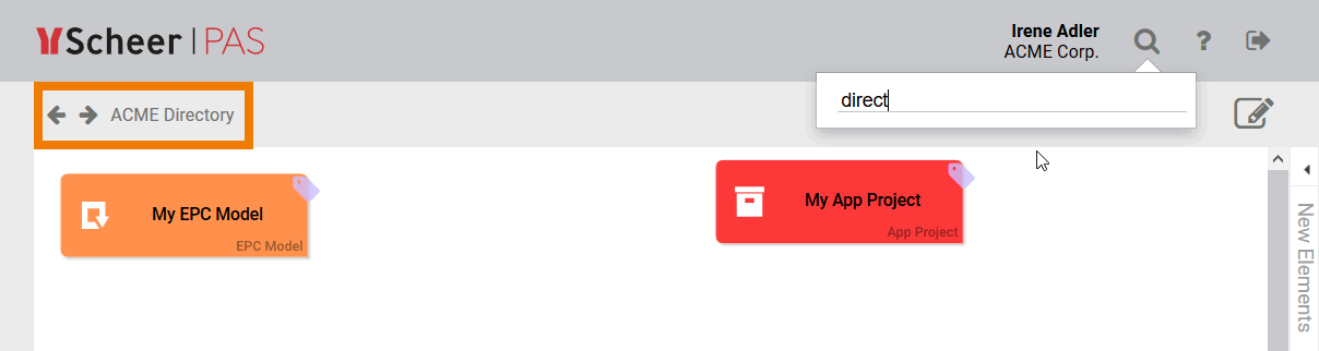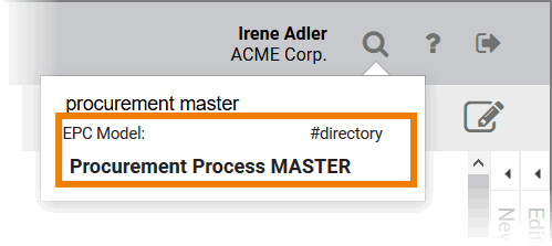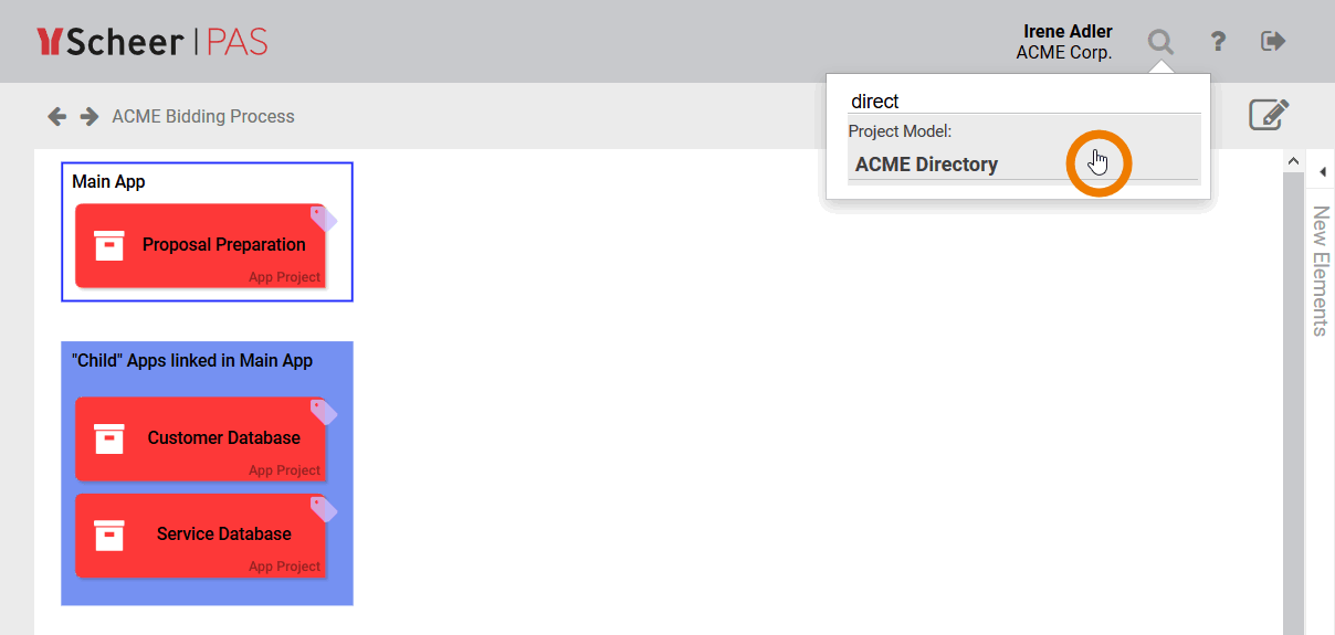 Irene Adler is currently working in the project ACME Bidding Process. In the global search she enters the search criteria direct. The Project Model ACME Directory appears in the hit list and Irene clicks on it: