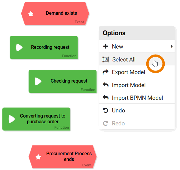 In order to mark all elements on a work surface open the context menu in an empty space and select the option Select All: