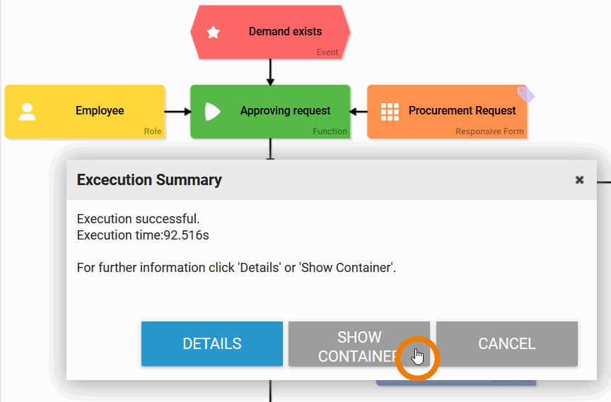 During testing it may be helpful to have a look at the container content. You have simple access to the container content in test mode. In the reference process' last form insert a Button and activate the option Go to Next Step.
