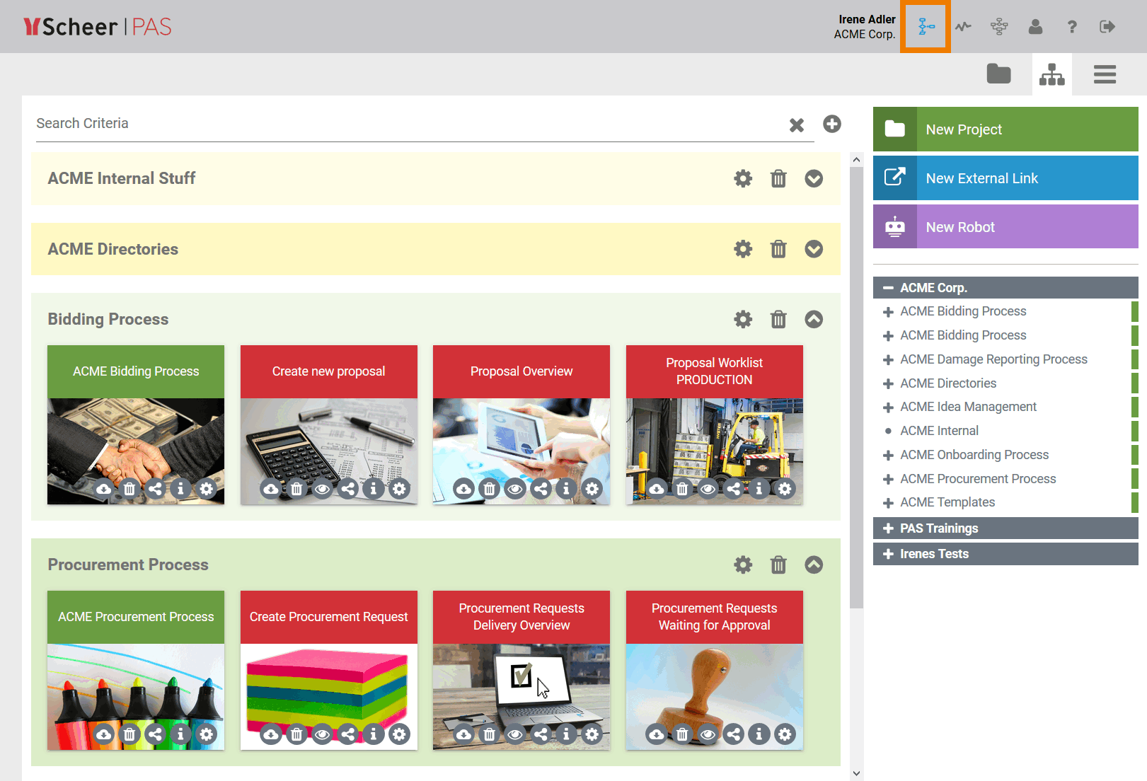 The main purpose of the Cockpit is to make your work easier: Here you can clearly structure your projects and apps with the help of user-defined groups, create tiles for direct access to projects and process apps and display entire projects hierarchically. All settings are saved: After logging in to BPaaS again, you will find your cockpit exactly as you left it.