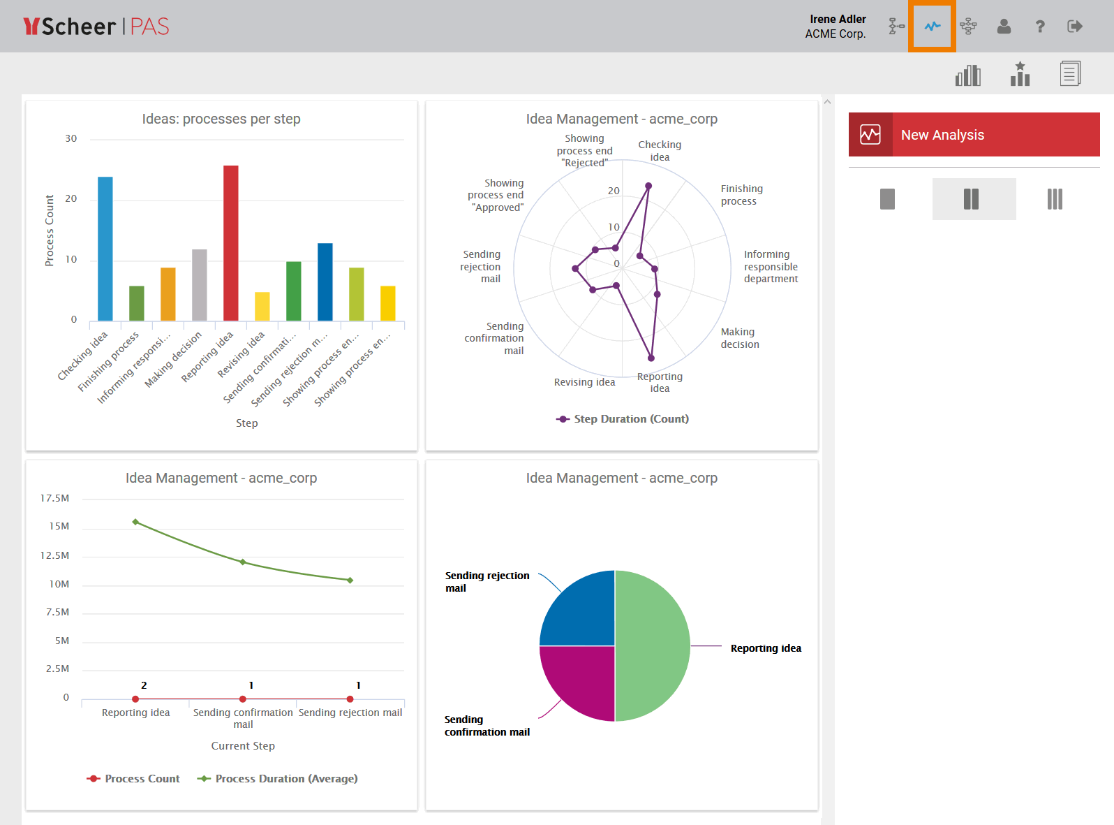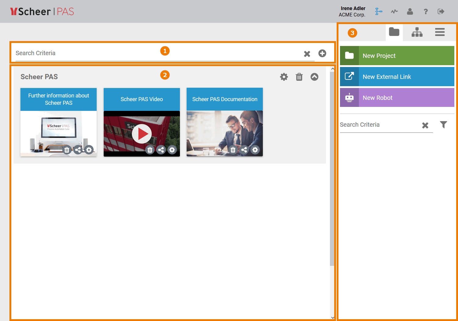 After logging in you are directly in the Scheer PAS Cockpit. The Cockpit is your gateway to the world of Scheer PAS - you can design it according to your wishes and requirements.
