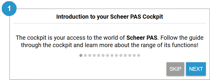 Use the buttons to navigate through the introduction. If you want to see the last step again, click on Back. If you want to go on to the next step, use the Next button. With the Skip button you can cancel the introduction at any time. After the last step you can end the introduction by clicking on the Close button.