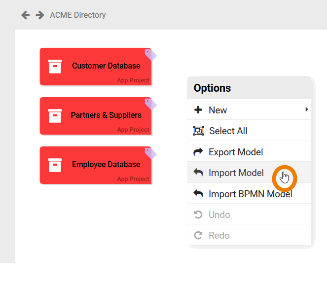 On the workspace of the ACME Directory project Irene opens the context menu and selects the option Import Model:
