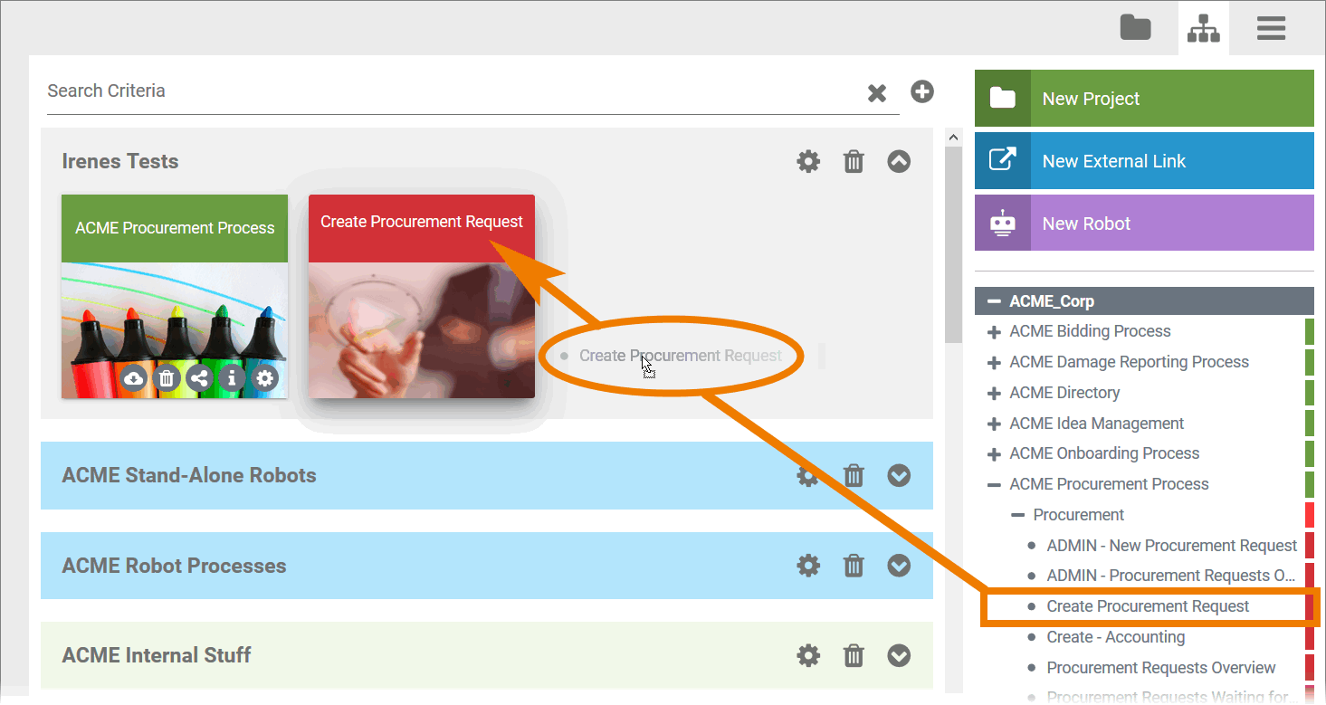The imported project is also displayed in the Tree Sidebar. Since the project was copied from Irenes Sandbox to the ACME Corp. profile, the project is available in both profiles, including its start links: