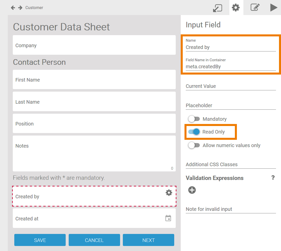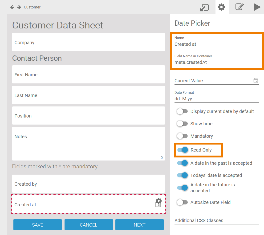 The meta information meta.createdAt is to be used in the Created at field. As the user should see the date in a readable format, the element Date Picker is used.