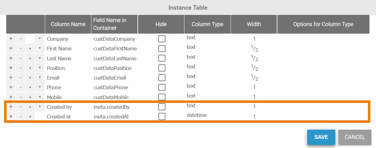 Additional information about instances can be helpful in overviews, for example if you want to know when an instance was created or last changed - and by which user. Each instance contains a set of meta information, corresponding fields are automatically provided in the container.