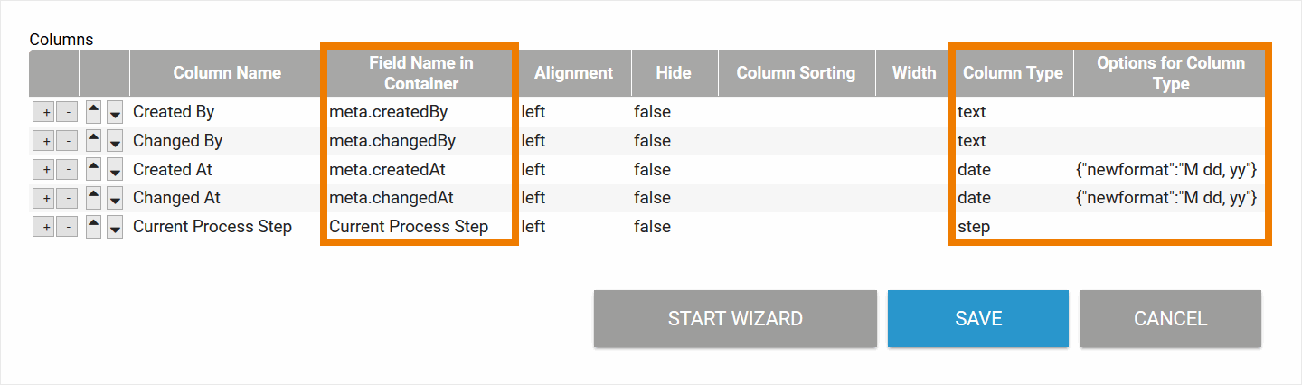 The two fields containing meta information are also added to the configuration of the corresponding overview: