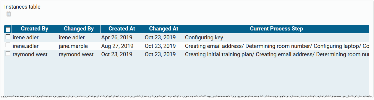 The column Current Process Step with the column type step is filled with the name of the process step in which the instance is currently located. These can be several (parallel) steps in an app with parallel execution.