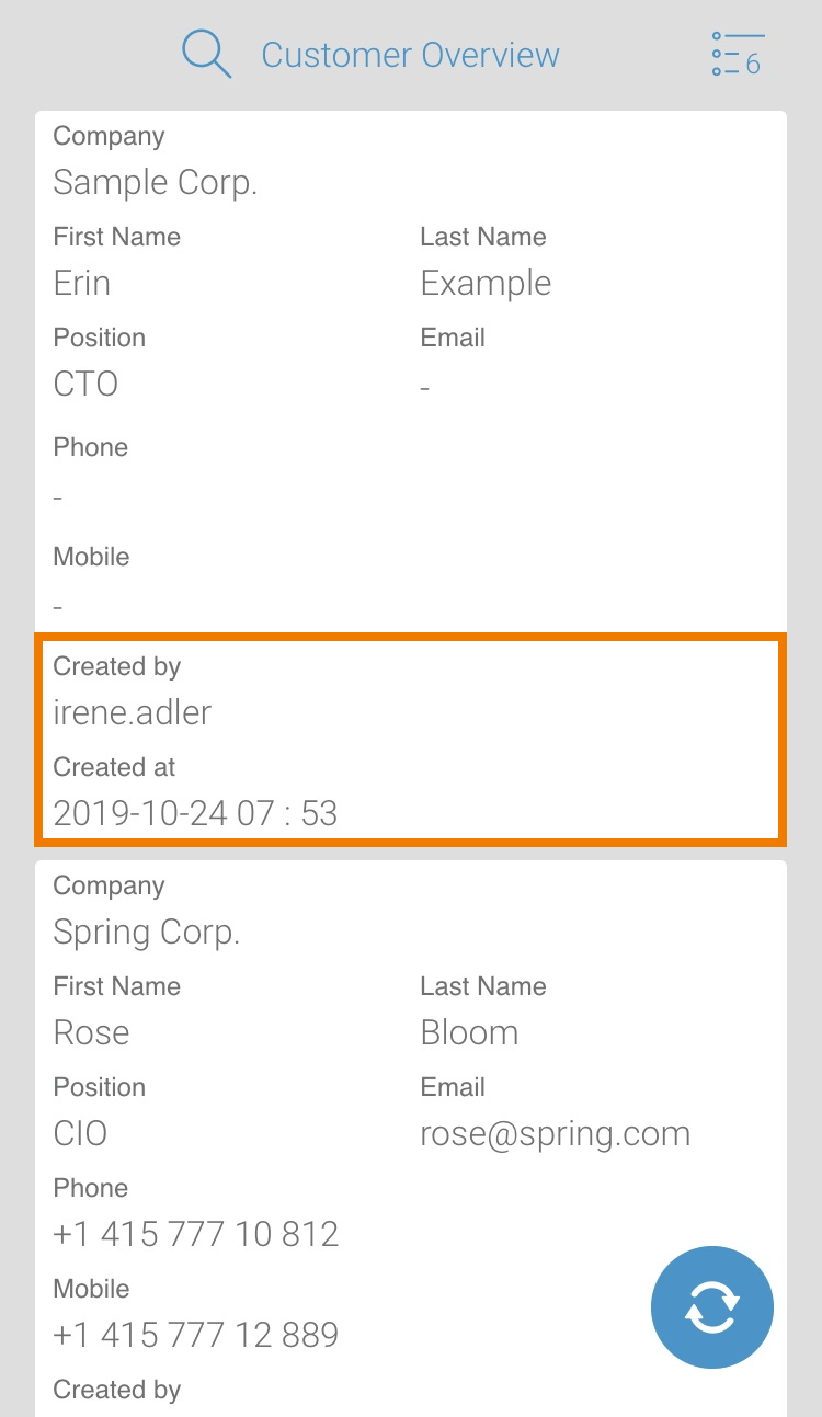 If the user opens the form on his mobile device, the fields Created by and Created at are empty, because the metadata is not available at this time: