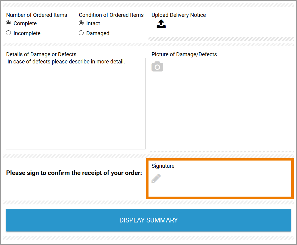 Irene Adler would like to enable the employee to confirm the receipt and inspection of the ordered goods by signing the form. Therefore she inserts the signature element Signature into the form. Since the employee is required to sign the form, she also activates the option Mandatory for the element: