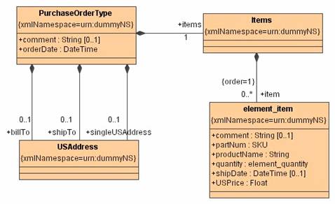 For the above example this implies that billTo, shipTo and singleUSAddress elements must be given as optional – that is, lower multiplicity = 0 – associations. billTo and shipTo are defined using an elementGroup element which is explained in the next section. Note that there is nor order tagged value, because the UML attributes and associations are not fully ordered anymore, if there is at least one choice content model present. Which leads to another rule: