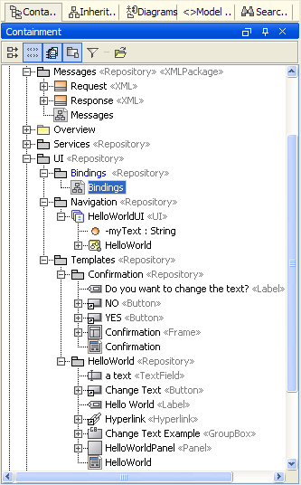 For this tutorial there are two UI elements, the HelloWorld label and the text input field, which need to be bound to the data model. The data model consists of the classes within the Messages repository, changeHelloWorldText and changeHelloWorldTextResponse. Due to the fact that there is the myText global variable defined within the HelloWorldUI it becomes part of the data model itself.