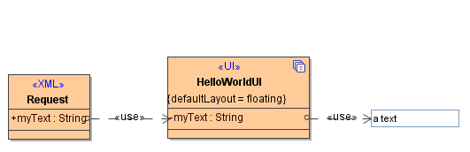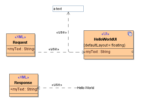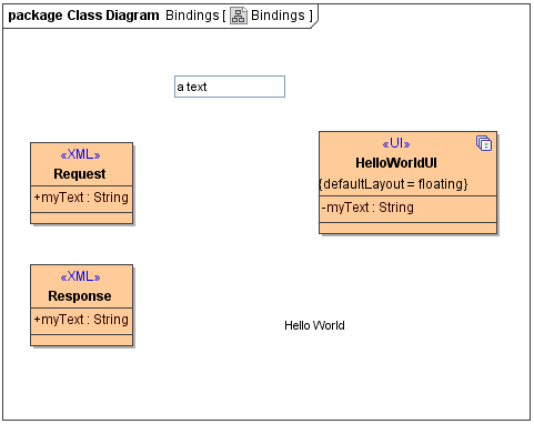 | The last binding is between the Hello World <<Label>> and the SOAP operations Response object to make the myText available to the Hello Wold <<Label>>. |