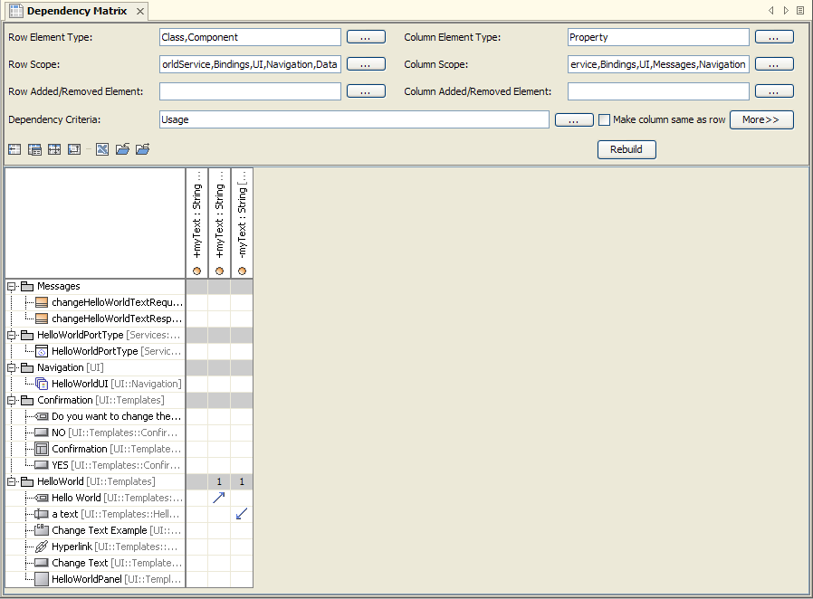 The Dependency Matrix shows all user interface components and their connection to the class properties of the data model. The direction of the arrows show the usage dependencies directions. The Hello World label (having an up arrow) uses the data from the changeHelloWorldTextResponse class attribute myText. On the other side the global variable, residing in the State Machine, is getting its data from the a text text field component.