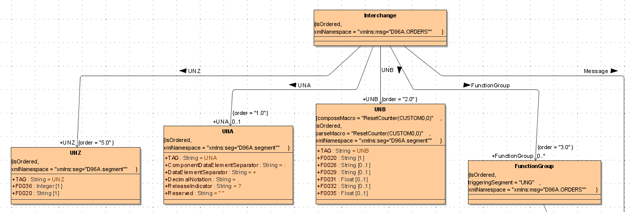 EDIFACT messages share segment and composite definitions for each directory (e.g. D96A). Thus, after importing one message (e.g. ORDERS) all segments and composites are imported as well. Importing an additional message such as PRICAT will only add the D96A.PRICAT.xsd.import.xml module, because segments and composites have been imported before. The imported messages can be displayed in a class diagram. The classes model the underlying EDIFACT data structure, for example the ORDERS Interchange class looks like: