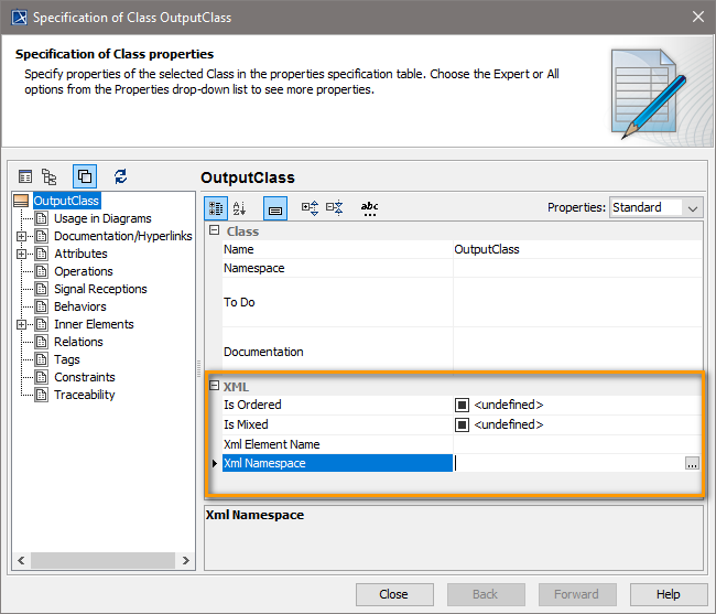 Tagged value xmlNamespace can also be used on classes with stereotype XML.