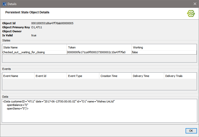 Refer to Persistent States of xUML Services for more information on how to view the same information on the E2E Bridge. You can read more on the concepts of persistent states and the E2E Bridge in the Reference Guide, Persistent States and Signals.