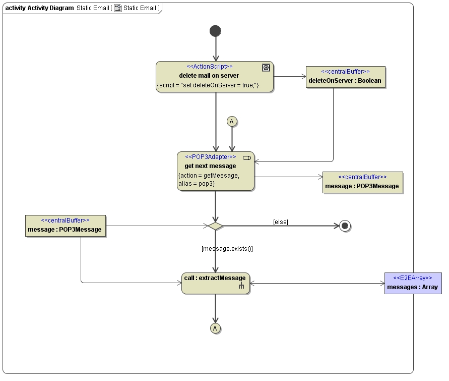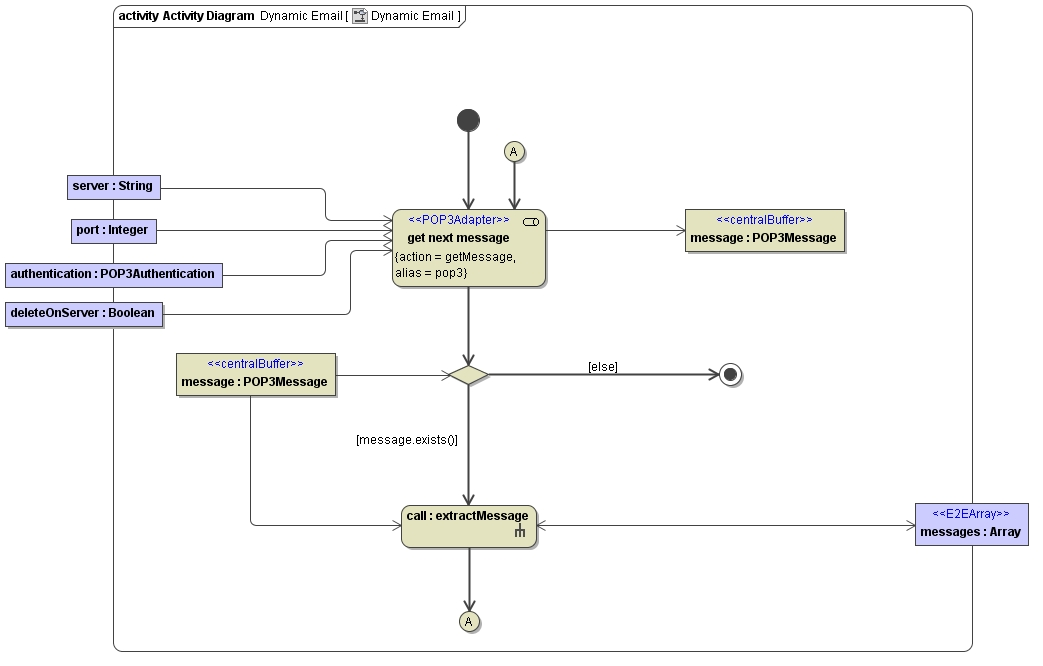 Action get next message in the activity diagram above has an input parameter deleteOnServer. This parameter is of type Boolean and indicates whether the message is to be deleted after it has been fetched by the POP3 adapter. If the parameter is set to true, a DELE command is send to the POP3 server and the message will be flagged as to be deleted.