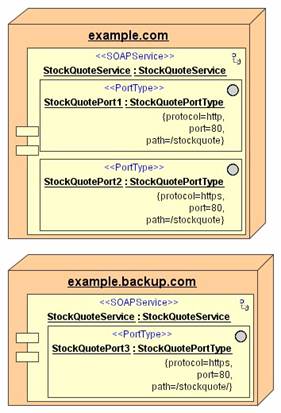 There is no model element that corresponds to a WSDL port because the address information is mapped to the location of service and port type instances in a deployment diagram. Binding information like the transport protocol – for instance HTTP – or the network port are mapped to tagged values residing on instances in the deployment diagram.