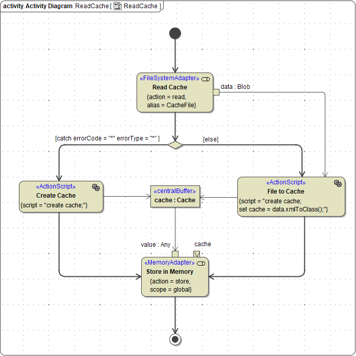 The example shows a simple caching service. On service startup, the startup activity reads the data from the cache file and stores it into memory. While the service is up and running, new data may be added to the data in memory. On service shutdown, the data is written to the cache file to be available on next service start.