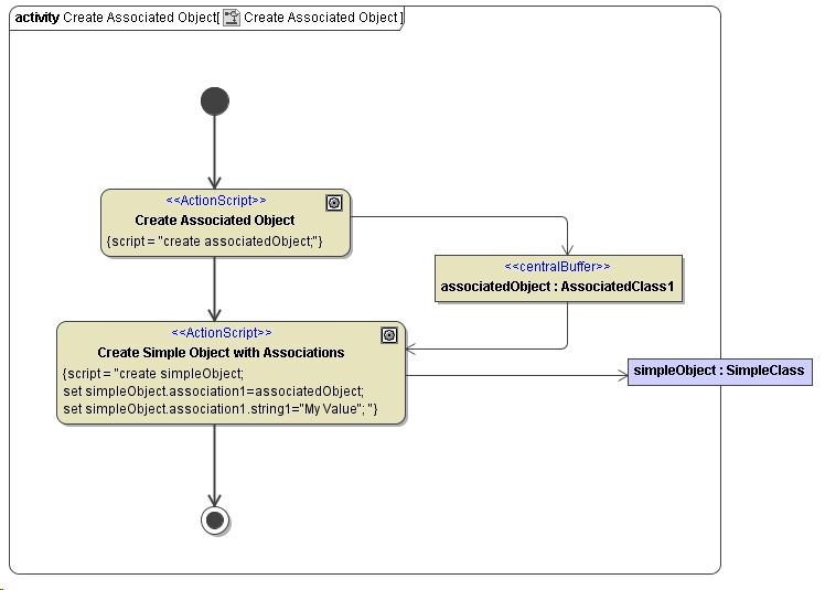 In the first step, the object of the associated class has to be created (see action node Create Associated Object). This object can then be used in the second step, where the SimpleClass is instantiated (see action node Create Simple Object with Associations).