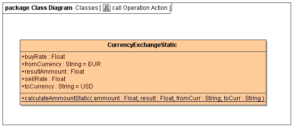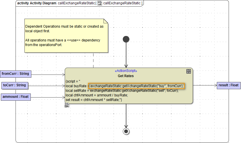 Give the <<use>> dependency a name, like exchangeRateStatic in our example. Via this name the class and its operations can be accessed within action script.