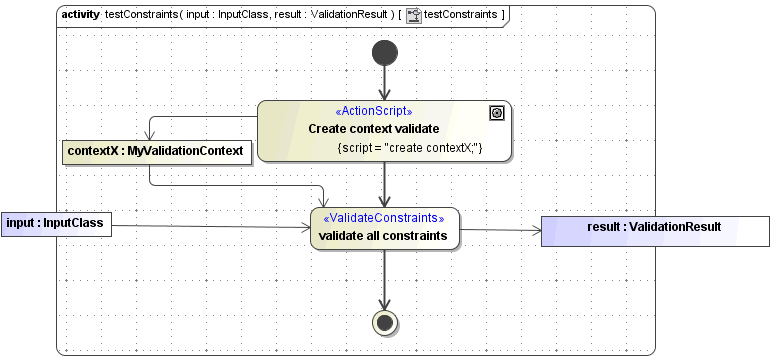 The constraint applied to aString uses the objectX . This object must be an instance of a <<ValidationContext>> class that is provided as input to the <<ValidateConstraints>> action as shown in the figure below: