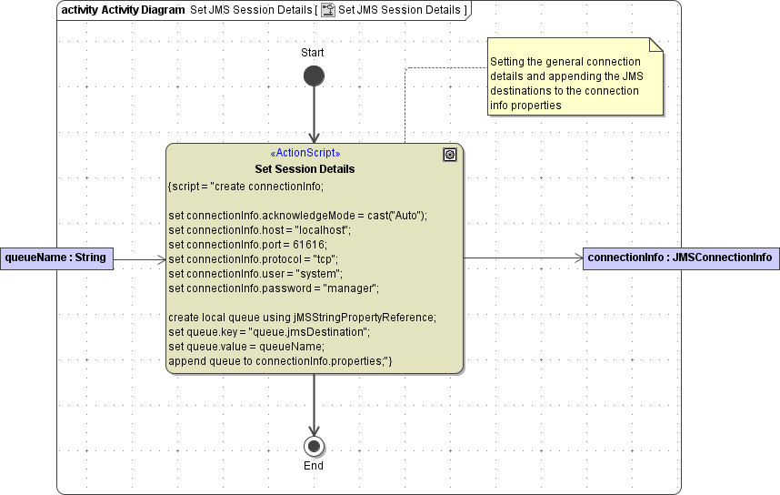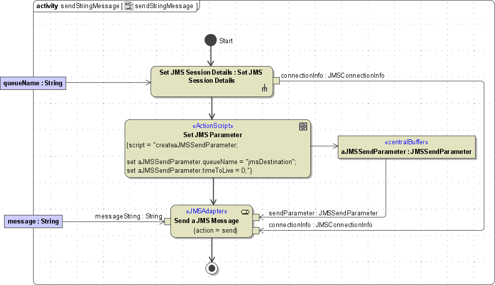 In the example, the parameter queueName specifies the name of the queue, to which the activity sends messages. Connection details such as host, port, protocol, etc. are set in the call behavior action Set JMS Session Details.