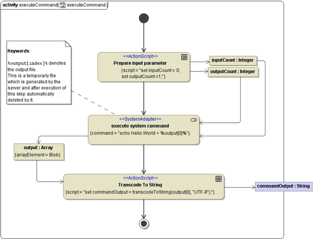 The next example shows the execution of a shell command with a static input parameter. That means that the parameter is set as a static string within the action script section: echo Hello World > %output[0]% (see action node execute system command in Figure: Executing a System Command).