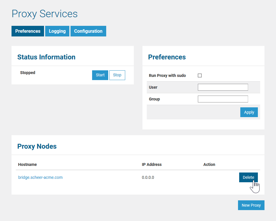 | Click the Delete button of the proxy node you want to delete. Make sure that official certificates you bought from a certification company, are exported before deleting the proxy node. The certificate files will not be removed on delete but are overwritten, in case you create a proxy node with the same name again. |