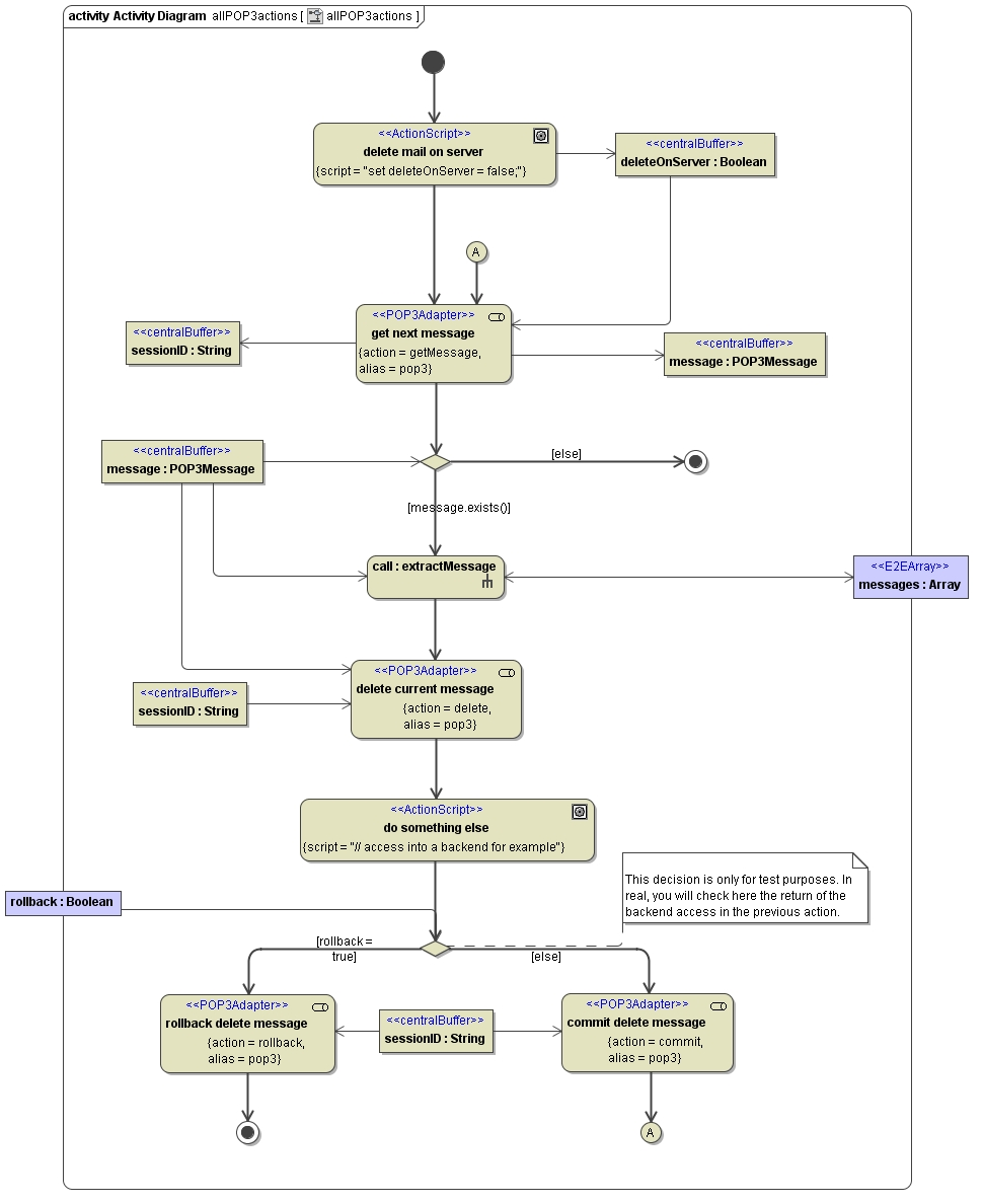 Action get next message in the activity diagram above has an input parameter deleteOnServer. This parameter is of type Boolean and indicates whether the message is to be deleted after it has been fetched by the POP3 adapter. If the parameter is set to true, a DELE command is send to the POP3 server and the message will be flagged as to be deleted.