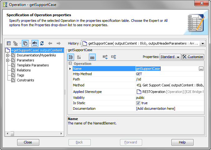 In the example, the complete path to a specific support case is http://localhost:12007/supportcases/<id of the support case> and that link will call the operation getSupportCase. (Whereas we assumed that the service runs on localhost.)