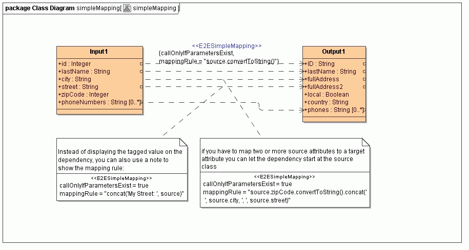 The most trivial mapping is done by just drawing a dependency between two attributes. For example, lastName is identical in class Input1 and Output1.