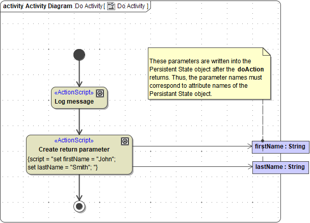 The <<PersistentState>> class owning this do activity has two attributes having the same name and type (see following class diagram). Therefore, after finishing the do activity, these two parameters get synchronized with the persistent state object attributes firstName and lastName.