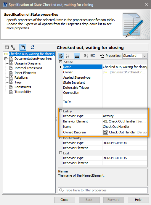 The entry behavior is defined in the Entry compartment of the state's specification dialog