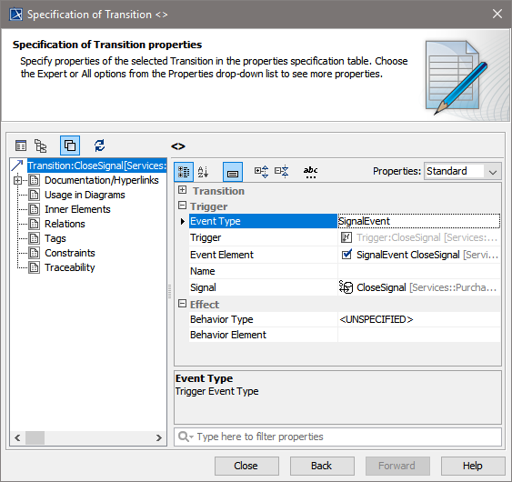Transitions starting from states can be triggered by signals. The example below shows a transition that is triggered by the CloseSignal.