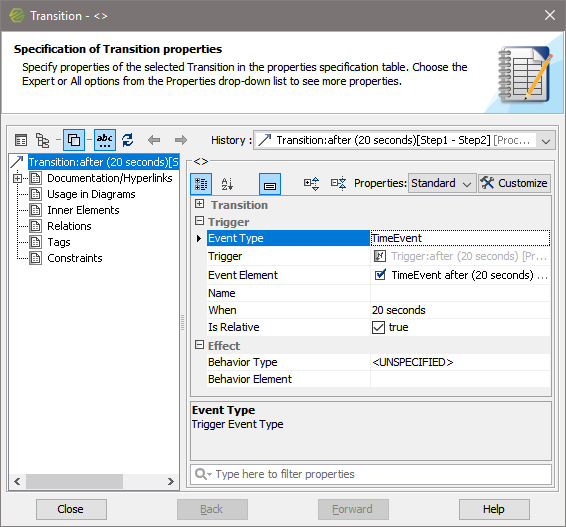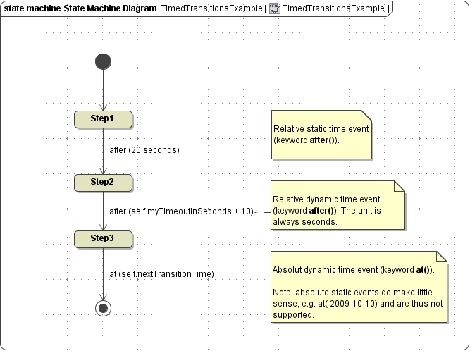 | Relative time events using dynamic expressions | See for example the second transition in the above state chart. Return type of the expression must be Integer. Unit of measure is seconds. This is sensible for short timeouts, e.g. 30 seconds. Again, the Is Relative flag must be set to true. |