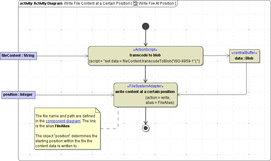 The directory where the file should be created and the file name are defined in the component diagram. The link from the activity diagram to the physical information is established by an alias (in the present example: FileAlias). See File System Components for more information on file system aliases.