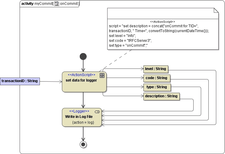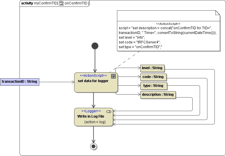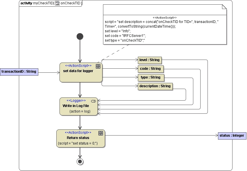 The semantic of this interface is described in tRFC Service. However, the current example does not manage TIDs properly, but just logs the transaction ID to the file system. This is done purely for educational purposes enabling the modeler to observe the transactional behavior of the SAP system.