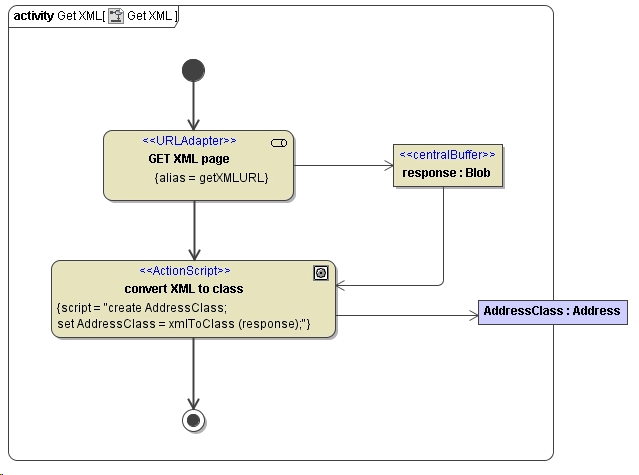 The following activity and deployment diagram shows a Service which gets data from http://www.e2ebridge.com/bridgeFiles/address.xml and sends back the following data structure: